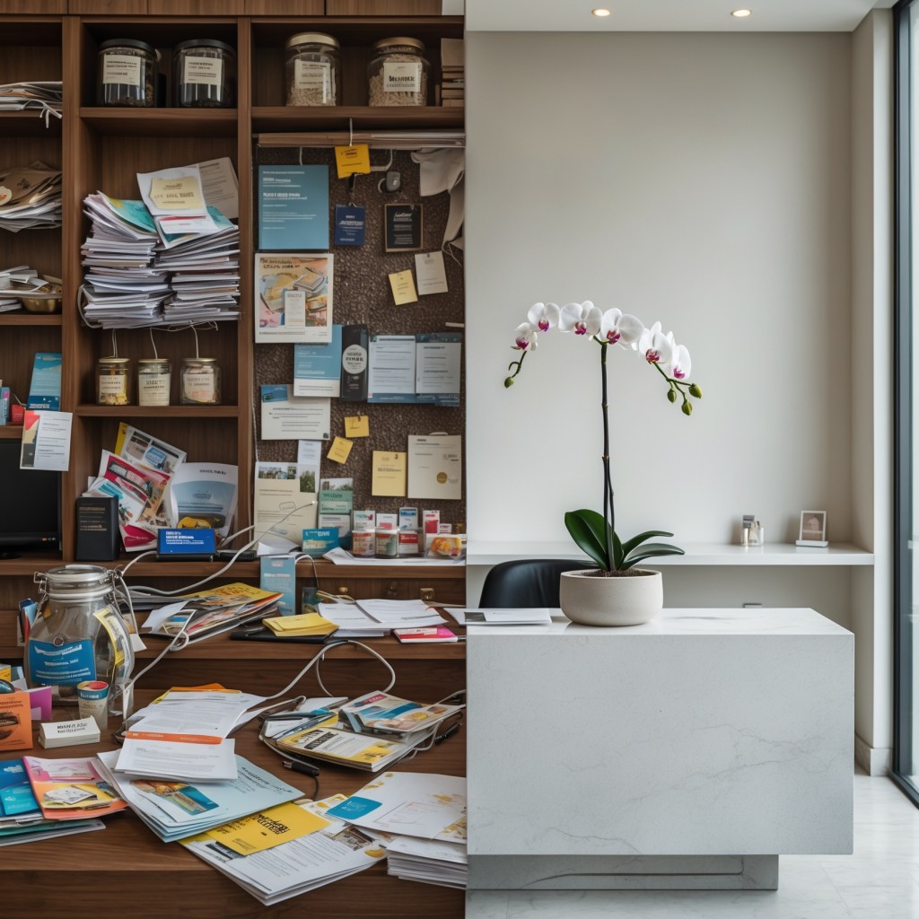 ❌ Mistake: Reception is cluttered with papers, wires, decor, snacks