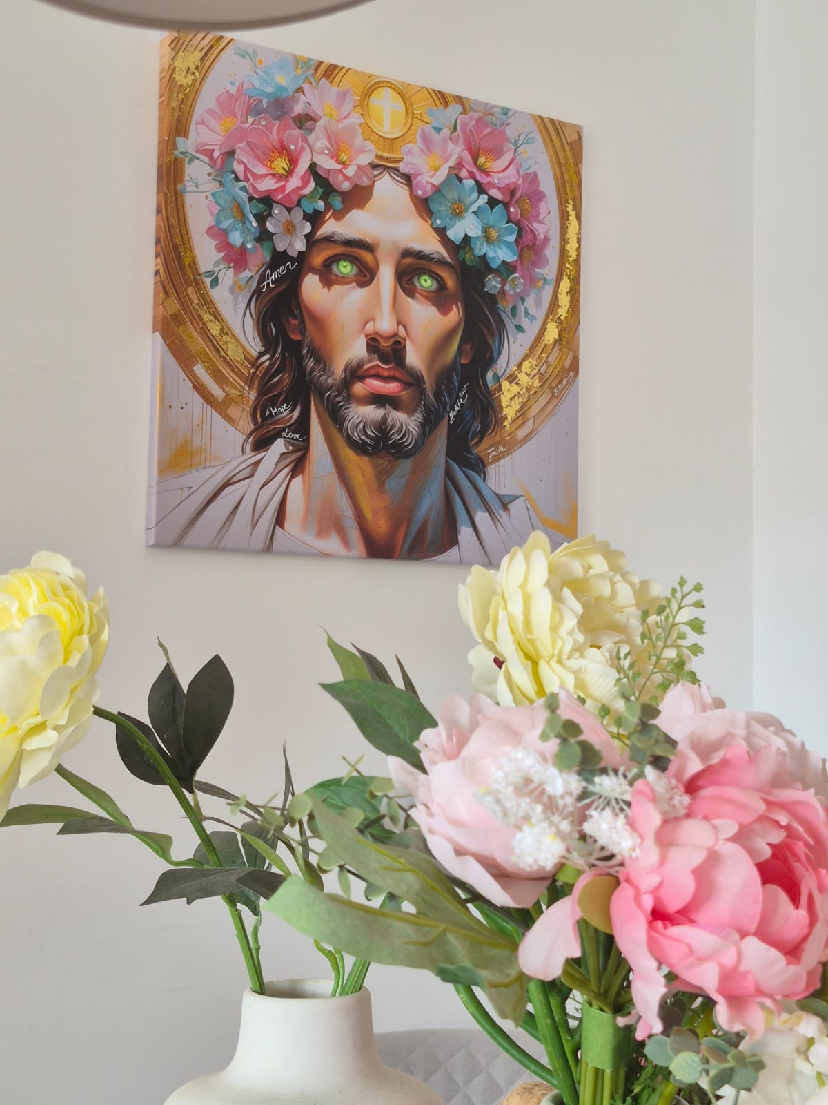Every detail — the golden glow, the words Amen, Blessing, Faith, and Love — reflects the presence of Jesus and the strength that comes from His light.